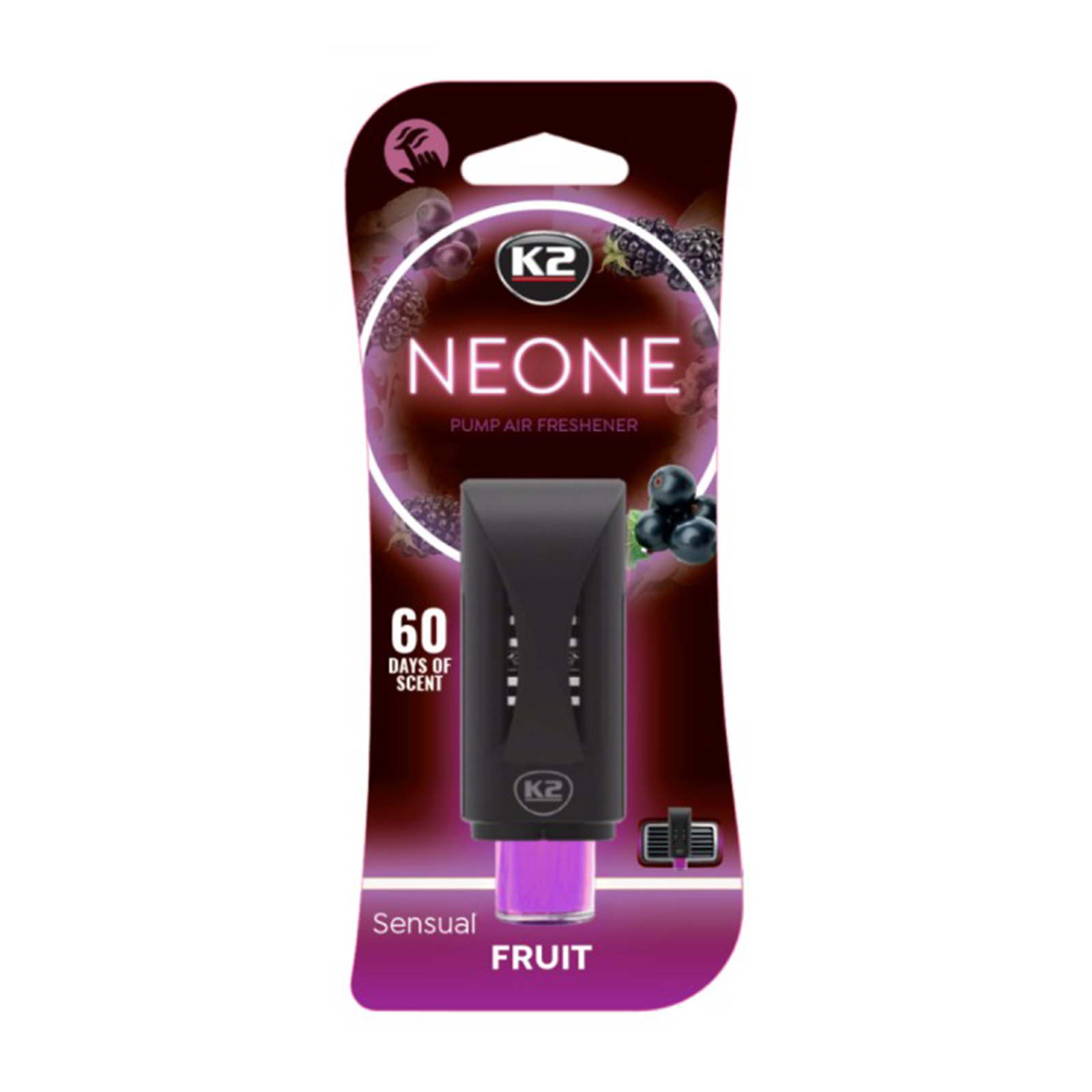 K2 Sensual Fruit este un odorizant auto pentru grila de ventilație, conceput pentru a transforma atmosfera din mașina ta. Designul cu pompă îți permite să ajustezi intensitatea parfumului, de la o aromă discretă la un parfum bogat și intens.