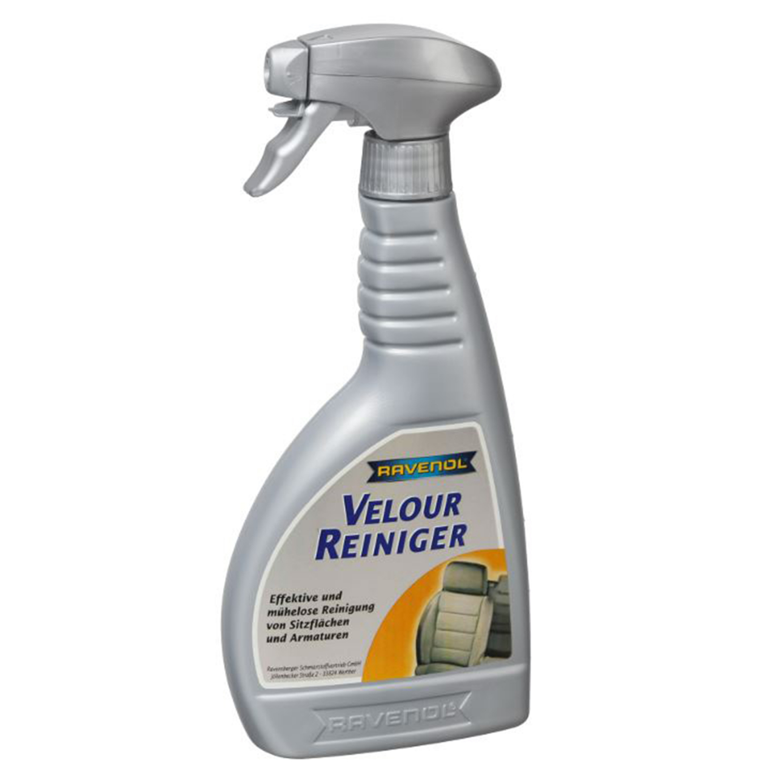 RAVENOL Velour-Reiniger este un produs de curatare fara fosfati, pentru husele scaunelor, covorase, garnituri interioare si pentru toate suprafetele din plastic din masina. Usor de manevrat si curata eficient. Indeparteaza petele, urmele de nicotina si de mancare, eliminand in acelasi timp si mirosurile. Suprafetele nu sunt atacate.