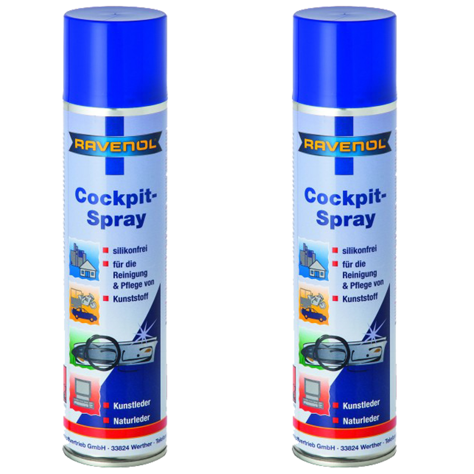 RAVENOL Cockpit-Spray este utilizat pentru ingrijirea si curatarea componentelor din plastic si interioarelor vehiculelor. Dizolva murdaria si atrage particulele fine de praf. Este necesar a lustrui suprafetele dupa utilizare, astfel incat sa se indeparteze mecanic depunerile de pe suprafete si pentru a distribui uniform produsul. Creaza o pelicula de potectie si lubrifiere care nu este unsuroasa, nu lasa pete, este integral sintetica si lasa suprafetele stralucitoare, oferind protectie impotriva razelor UV si imbatranirii prin oxidare cauzate de lumina intensa a soarelui (ex.: protejeaza impotriva formarii de crapaturi, uscare si decolarare). Suprafetele tratate vor ramane fara praf o perioada mai lunga de timp.
