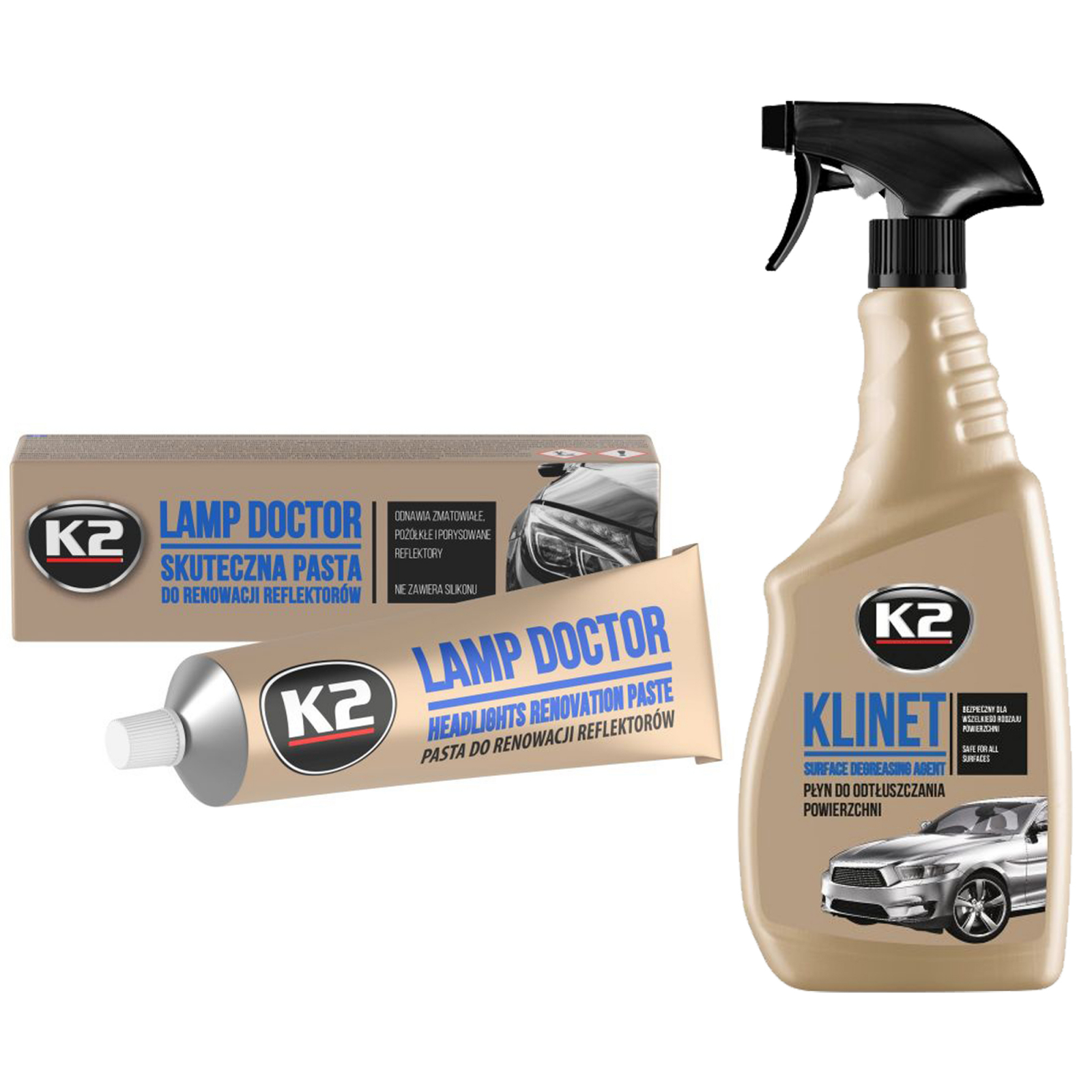 Pachet pasta K2 pentru restaurarea manuala sau mecanica a farurilor 60g + degresant K2 cu pulverizator pentru caroserie 750ml